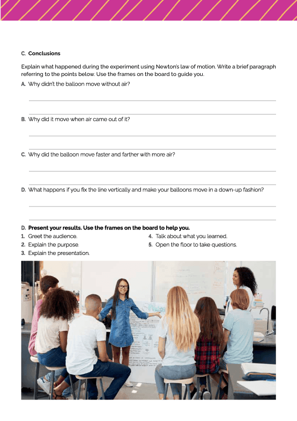 - Estruturas de linguagem: A repetição de frases-modelo (I believe it happens because…, The balloon moved because…) ajuda a consolidar padrões linguísticos e promove a produção de linguagem estruturada.